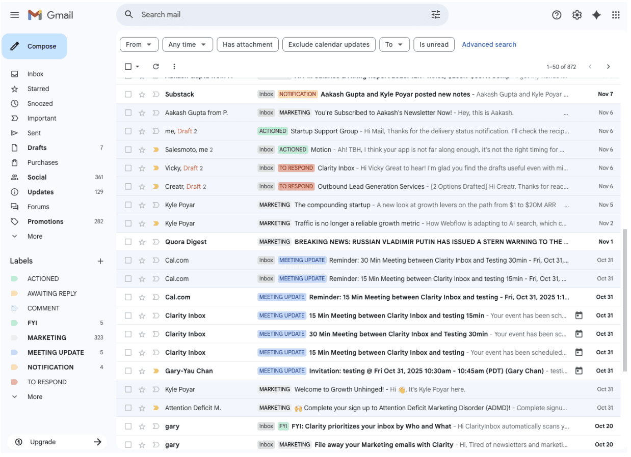 "imagine if your VA took, say, Monday morning to ... categorize ... all your new mail and even write suggestive follow-up notes in your drafts. That would probably be a pretty great feeling, right? ... that's what Clarity is doing for you."